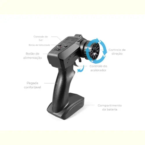 O carrinho de brinquedo infantil acompanha controle remoto sem fio, com comandos de frente, ré, esquerda e direita, oferecendo total controle do percurso e facilitando o uso por crianças. -