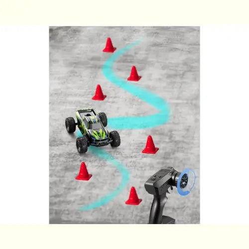 Carcaça em plástico de alta resistência e rodas grandes com textura emborrachada permitem que o carro de brinquedo enfrente pequenas pedras, pisos irregulares e obstáculos leves com estabilidade. -