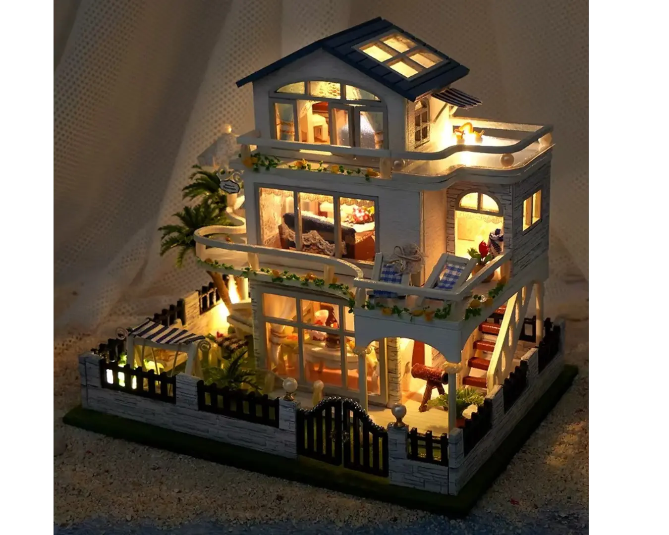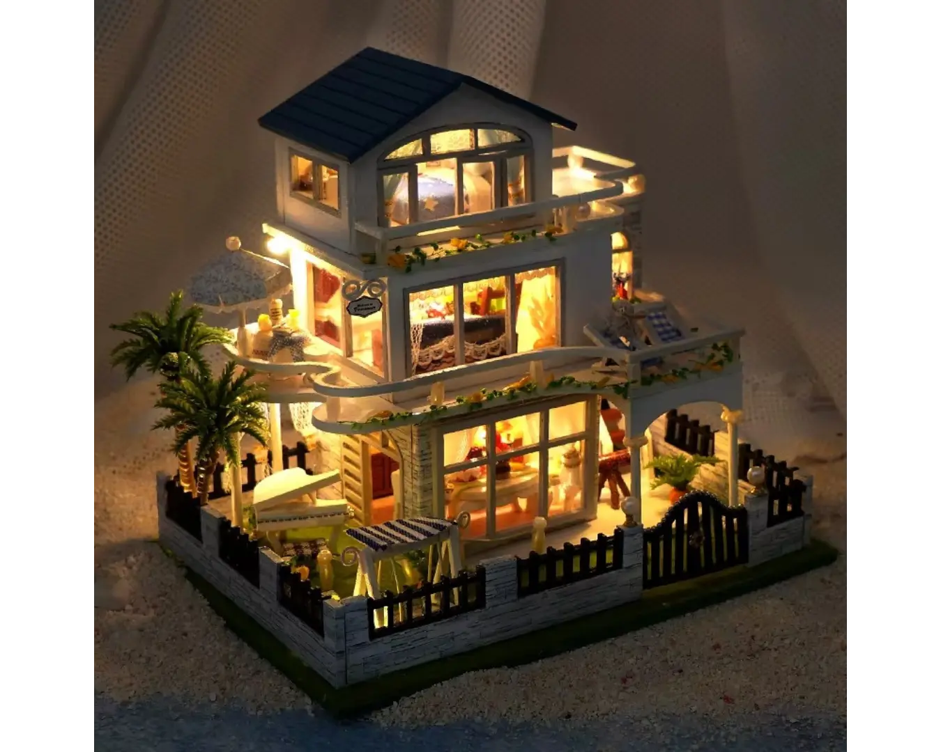 A Casinha de Brinquedo Madeira Beira-Mar vem com móveis, objetos decorativos e iluminação LED que realça cada ambiente, deixando o cenário ainda mais encantador à noite. Montada, ela se torna uma peça decorativa sofisticada, perfeita para o quarto infantil, home office ou sala de estar.